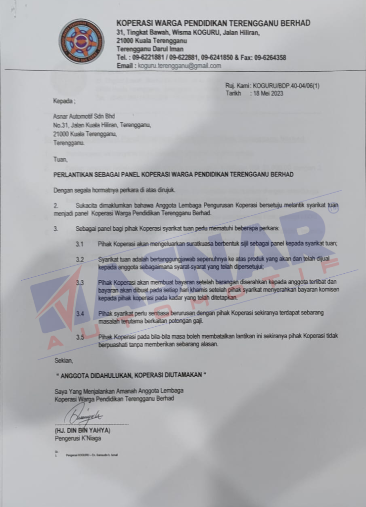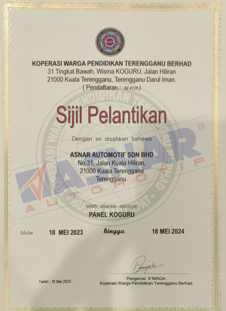 Dengan sukacitanya, kami ingin mengumumkan bahawa Asnar Automotif telah dipilih sebagai panel rasmi untuk KOGURU (korperasi guru). Kerjasama ini menunjukkan komitmen kami dalam menyokong industri pendidikan dan memberikan perkhidmatan yang berkualiti kepada guru-guru yang dihormati. Kami berharap agar kolebrasi ini dapat memperkuat hubungan yang sudah terjalin antara Asnar Automotif dan KOGURU, serta memberikan manfaat yang berkelanjutan kepada semua pihak yang terlibat